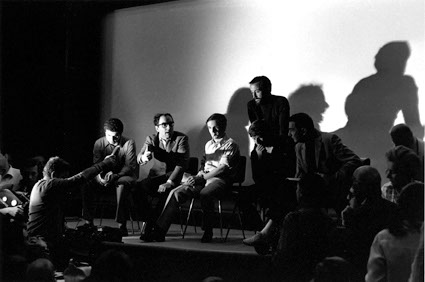 第 21 回カンヌ映画祭ボイコット(1968 年 5 月)の会場壇上に並ぶヌーヴェル・ヴァーグの監督たち。左から2番目がジャン=リュック・ゴダール(撮影・山田宏一)